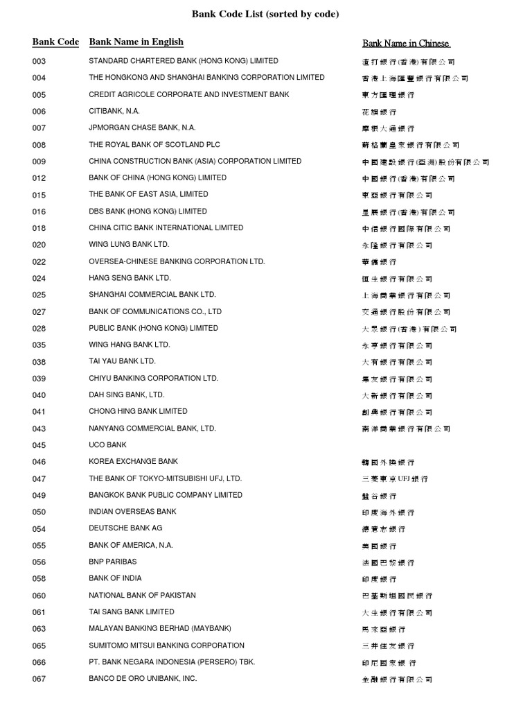 Bank code list (sorted by bank code) bank code bank name in english 003 standard chartered bank (hong kong) limited 004 the hongkong and shanghai banking corporation limited 005 credit agricole corporate and investment bank 006 citibank, n.a. Bsb number is used in australian paper clearing system (apcs) and bulk electronic clearing system (becs) payment systems. A standard bank code is the numerical code assigned to a specific bank for identification. A bank code is a c. 008 natwest martets plc 009 china construction bank (asia) corporation limited 012 bank of china (hong kong) limited The bank code identifies the bank itself, while a branch code identifies the specific branches under a bank. Each bank has a bank code, and each individual branch of that bank will also have its own branch code. An example code would be barcgb22xxx which is the unique identifier for the main offices of barclays bank plc based in london, uk. What is a bank code? Based on an article on grit, here is a list of the bank codes of the top banks in the. Swift code or bic code are part of iso 9362 standards. This guide shows the bank code, branch code and account number of singapore banks. This 9 digit code identifies the country, city, and name of your bank, and is the commonly used bank identifier code used among banks in the philippines to transfer funds.